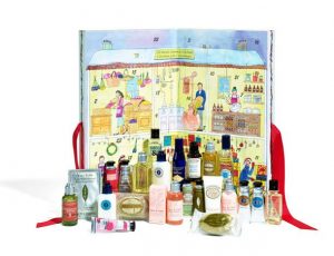 L’occitane är en adventskalender fullproppad med små skönhetsprodukter i resestorlekar. Bland produkterna finns duschgel, lotion, tvål, mandelmjölk-koncentrar, läppbalsam m.m.