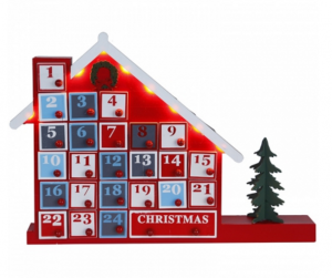 Adventskalenderhus med snygg LED-belysning under taket och lådor/fack för att fylla kalendern med små presenter. Lamporna drivs av batteri, så inga sladdar behövs.