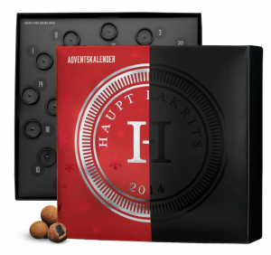 Adventskalender fylld med delikatesslakrits från svenska Haupt Lakrits. Varje lucka i kalendern innehåller minst två lakritsbitar.