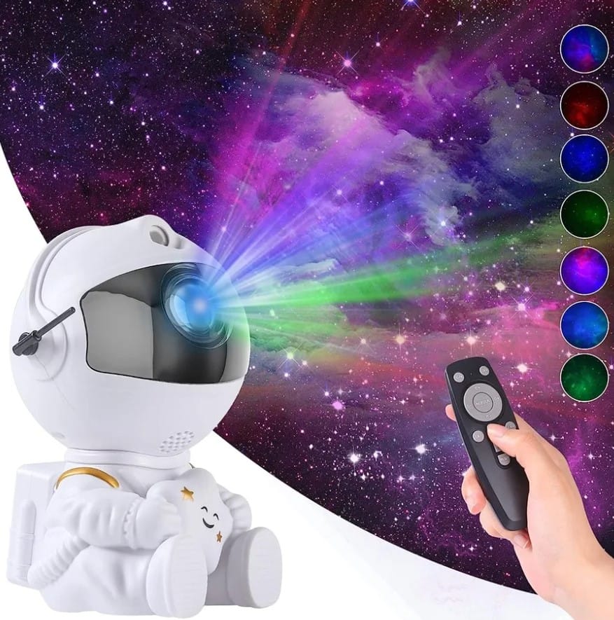 Nattlampa som lyser upp tak & vägg med stjärnor, galaxer och nebulosor. Bättre nattlampa får man leta efter. Du kan ändra inställningarna med den medföljande fjärrkontrollen eller knappar på baksidan av astronauten. När Galaxlampan projiceras kommer det kännas som att du är mitt i en stor galax. Dina barn kommer helt enkelt älska den här nattlampan. Astronaut nattlampa GalaxyNattlampa för barnKan byta till massa olika färger när det kommer till galaxen och nebulosanFjärrkontroll medföljerUSB-Laddkabel medföljerManual medföljer