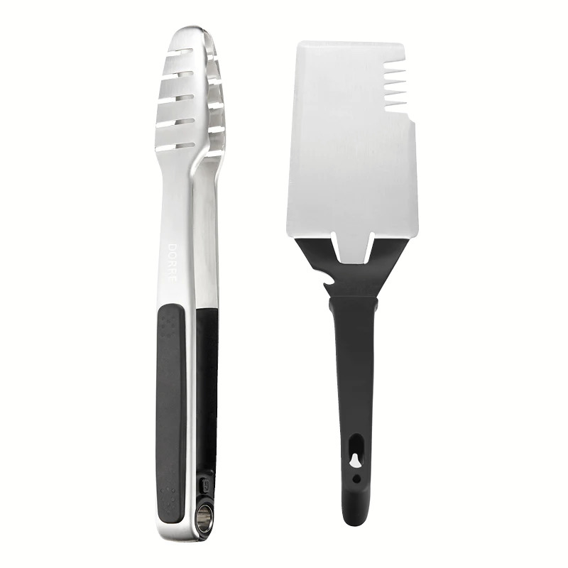BBQ grillset med grilltång och stekspade är stiligt designade i rostfritt stål med gummerade handtag. Slittåligt grillset som underlättar vid grillen.Längd:Grillspade 33 cmGrilltång 34 cm