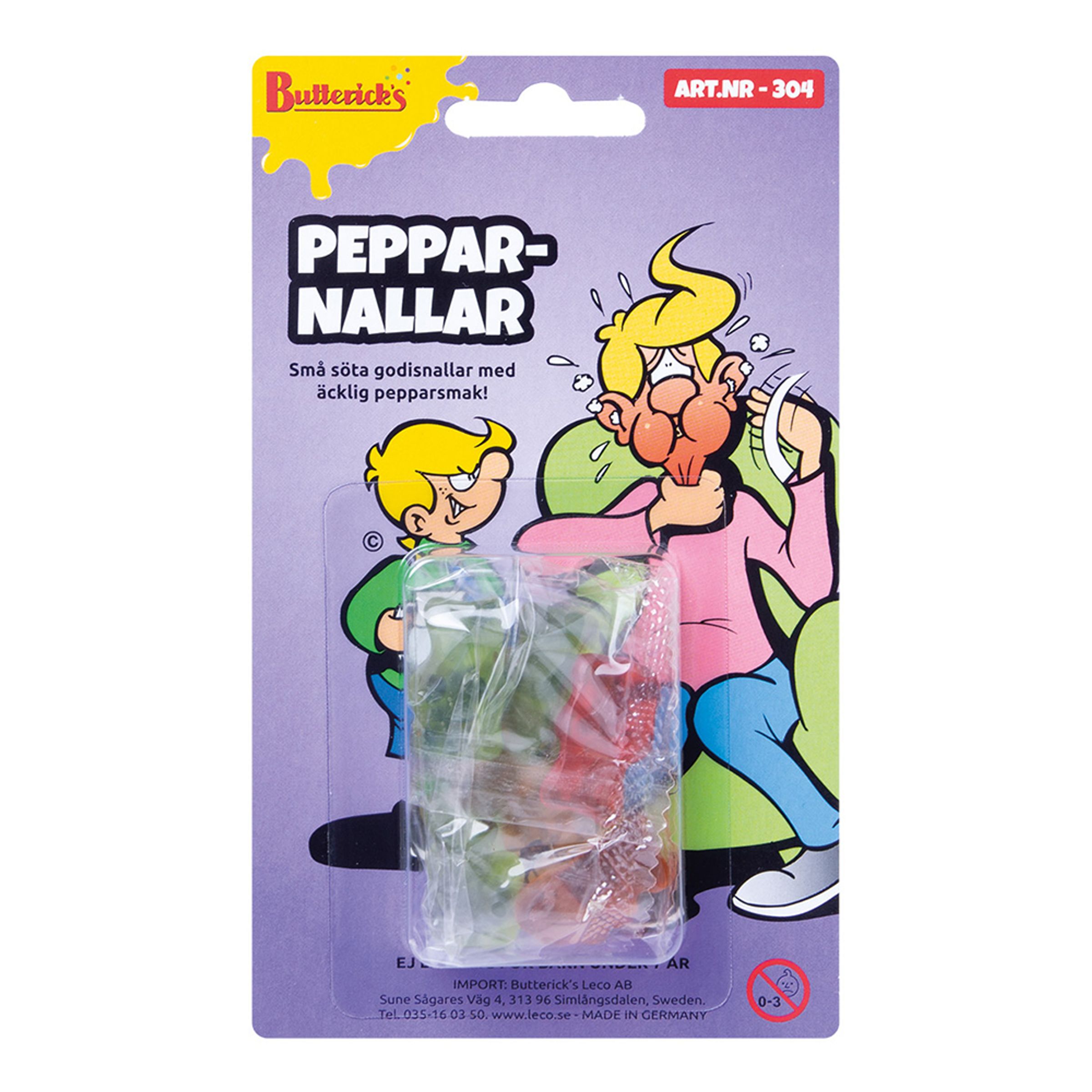 Överraska en vän med mumsiga gelébjörnar med pepparsmak. Ett hett tips är att du blandar ut de heta björnarna med din kompis vanliga godis, sen är det bara att luta sig tillbaka och vänta… En förpackning innehåller 6 st pepparnallar.