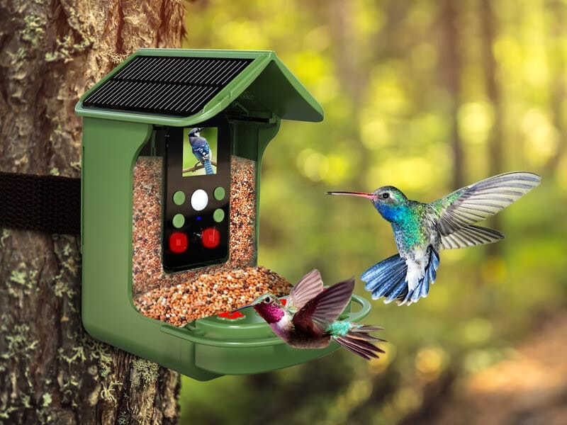 Mata och filma trädgårdens fjäderklädda besökare med denna fågelmatare från Denver! Fågelmataren är utrustad med solpaneler på taket och kan både fota och filma under såväl dagtid som nattetid.