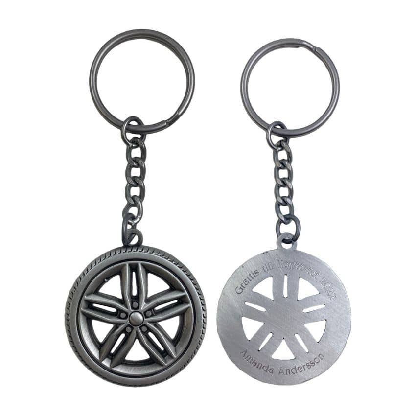 Nyckelringen kan graveras med två rader med valfri text på baksidan.